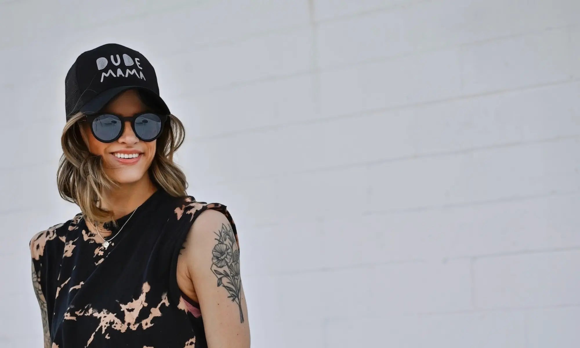 • Woman wearing a black Dude Mama hat and sunglasses, showcasing the boy mom hat style. Boy mom hat