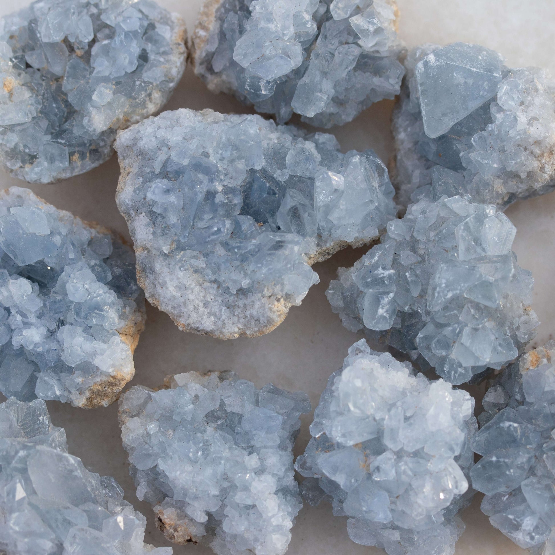 Blue Celestine is found in sedimentary rocks primarily in Madagascar. Its blue color comes from the interaction with strontium during the formation process. Celestine is found in cluster formations and also in geodes. The largest geode in the world is a 35 foot celestine geode. Most practical applications of the mineral involve extracting the strontium, which is used in fireworks, and the manufacturing of glass.